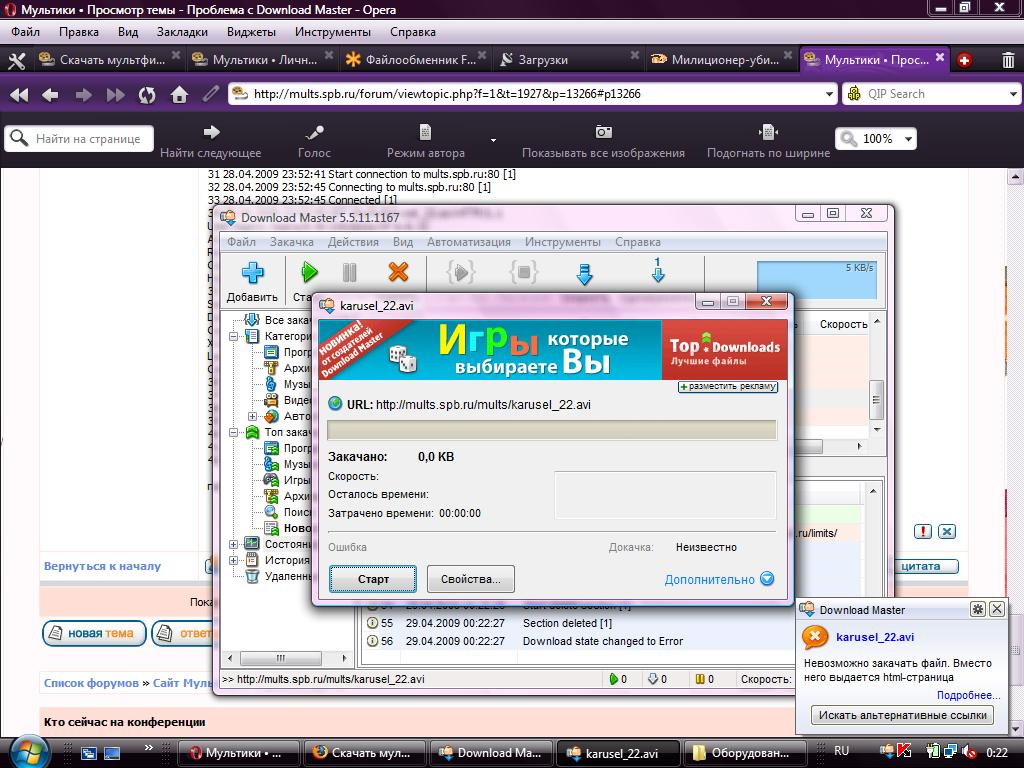 не могу скачать мультфильмы для ребенка. Заходил с разных браузеров (эксплорер, опера, мозилла, сафари), соглашался и пробовал закачивать с помощью Download Master (его настроил согласно Вашим рекомендациям),но все время вылетает ошибка, файл стал HTML страницей.