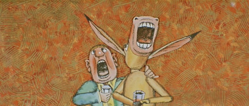 Случайно увидел по телевизору незнакомый советский мультфильм, герои которого - осёл и человек. Выяснил, что это мультипликационная заставка к фильму «Сто грамм для храбрости…» (Мосфильм, 1976). Фильм - советская антиалкогольная агитка. Состоит из трёх игровых новелл и анимационной заставки, представляющей собой двухминутный мультфильм с самостоятельным сюжетом на тему заголовка. Ослик и его владелец выпивают, катятся по наклонной и падают в пропасть. Существование мультфильма не учтено в этой теме - посему делюсь.