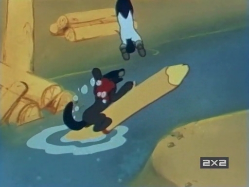Уважаемый Немухинский тут недавно нашёл оцифровку старого немецкого мультфильма с русской озвучкой Трое защищают свой дом (Drei verteidigen ihr Haus) (1984). В самом конце там волк и шакал падают в реку, а бобёр, которому они досадили в начале фильма, выбросив брёвна в реку при строительстве плотины, вынимает бревно из плотины и подбавляет воды, чтобы их смыло. Животные без одежды.