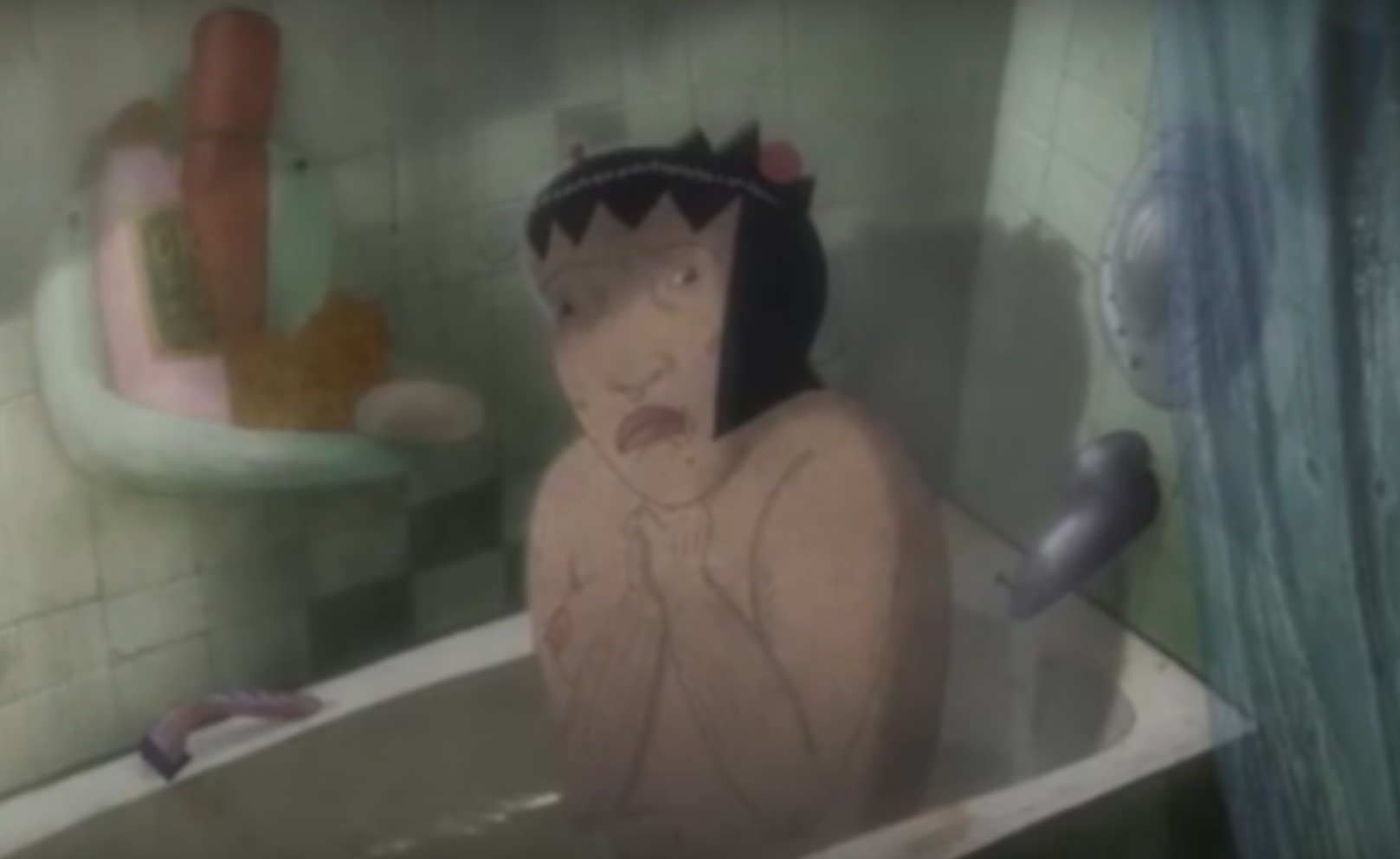 В нем была 2D рисовка, где люди были с реалистичными пропорциями(видимо с непривычно полным для зрителя телосложением), бледными лицами, маленькими, далеко, вроде бы, посажеными глазами и детализированно прорисованными морщинами, складками. Важно то, что анимацию я помню хорошей и качественной. То есть в программе напрямую говорилось о том, что людям отталкивающим кажется именно дизайн героев.