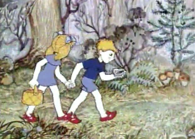 1. Начало. Дениска с Лариской собираются ранним утром, пока лагерь спит, в лес — собрать земляники к завтраку. Обратим внимание, что в руках у Дениски — красный мяч (зачем — непонятно, но взял и взял):