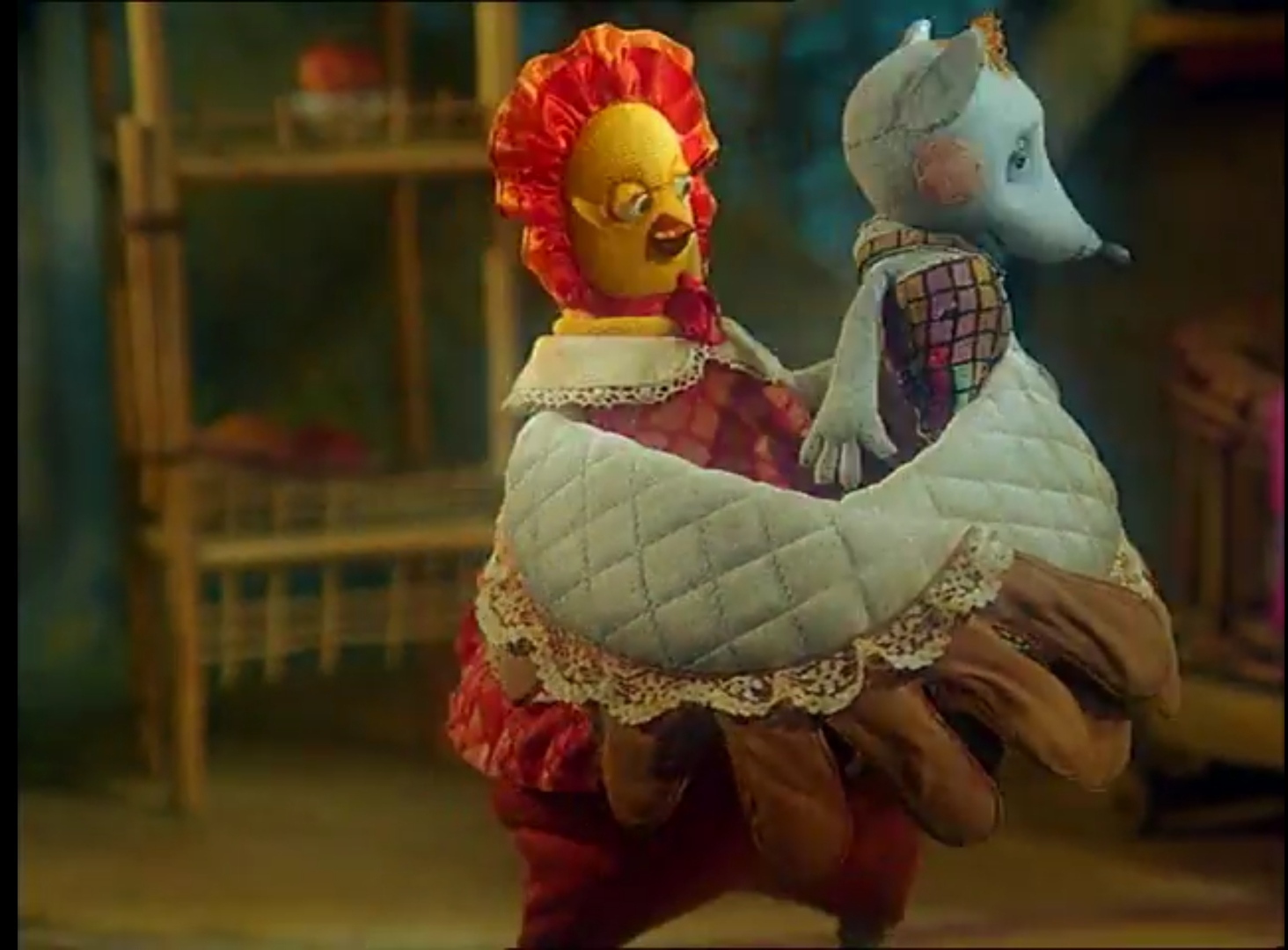 А вот фильм совсем не старый, но сделан очень оригинально и озвучен качественно. Приятно удивил нас когда-то, детям полюбился. Кадр обрезал. Что же Курица держит в своих руках?