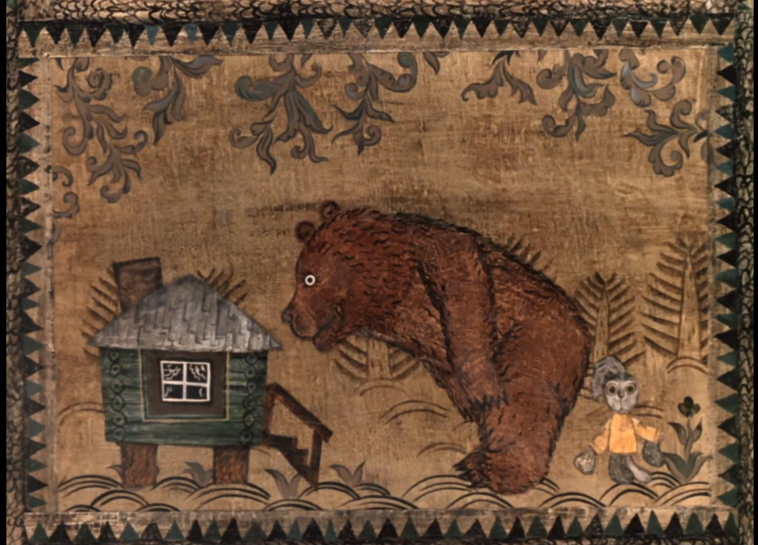 Справа от Медведя Заяц, а слева - заячья избушка с Лисой.