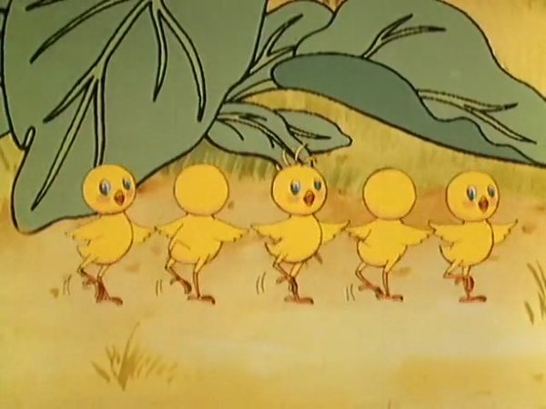 Ну, последний цыплёнок действительно очень условный. По-белорусски фильм называется буквально "Сказка о глупом птенчике" и герой как-то совсем не похож на цыплёнка, и братья-сёстры его, появляющиеся под "Балет невылупившихся птенцов" - сомнительные цыплята, русскоязычное название странное, конечно.