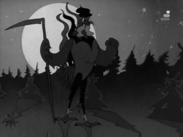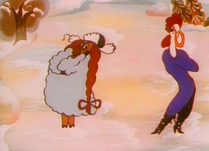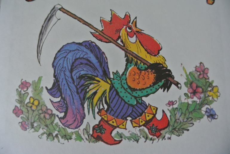 3. Вот тут можно поговорить, почему петуха нередко изображают с косой. Очевидно, по той же причине, по которой его часто изображают в сапогах со шпорами или с металлическими шпорами на голые ноги. Это игра слов: шпоры - часть тела птицы, и коса - часть тела птицы. Косами называют хвостовые перья петуха. Это народное название обыгрывается в самых разных жанрах фольклора. Например, в загадке: "Сидит петух на воротах: косы до полу, голос до неба? (колокол)". В сибирской быличке нечистая сила спрашивает "Сколько кос есть?" и получает ответ: "Я девушка, у меня коса; теперь у петуха тоже коса; и коса - сено косить". Обыгрывается это название и в сказках. А оттуда, видимо, образ петуха с косой перекочевал в иллюстрации и мультфильмы, где коса стала самым настоящим орудием. Вот и в мультфильме Амальрика петух несёт косу на плече, хотя сюжетом сказки "Теремок" это никак не мотивировано. Но есть известная сказка, где словесно-образное превращение пера-косы в настоящую железную косу имеет особый сюжетный смысл. Загадана экранизация именно этой сказки.